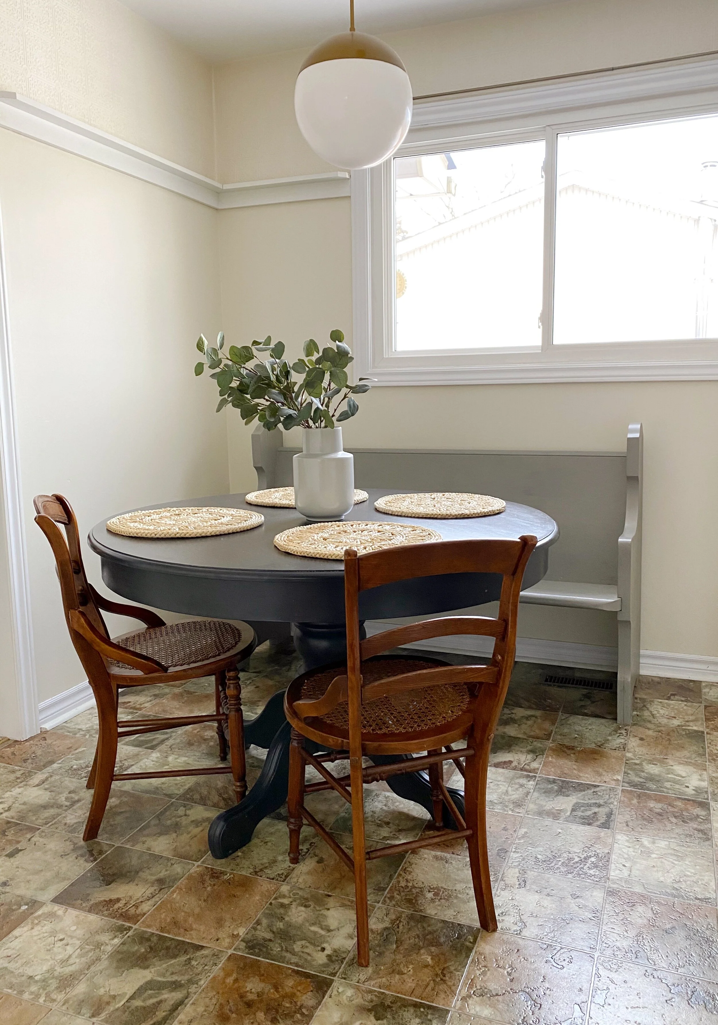 Sometimes the smallest changes can make the biggest impact. This past weekend, I lucked out on a buy-and-sell find of two beautiful antique wooden chairs that I could immediately envision in our eat-in kitchen. This little nook, though very far from perfect, is one of my favourite spots in our home. When we first moved in and needed a table, I sourced the beautiful round table from our local buy-and-sell and painted it with a deep charcoal chalk paint. I added an old church bench (which I purchased when my childhood church put the pews up for sale a few years ago) and an existing set of (poorly) painted chairs from the Habitat for Humanity Restore. This little space of collected furniture has served us well for the nearly two years we have lived here, but I always knew that I either wanted to refinish the tired old chipped chairs or find something new that could bring some warmth to this little corner.
