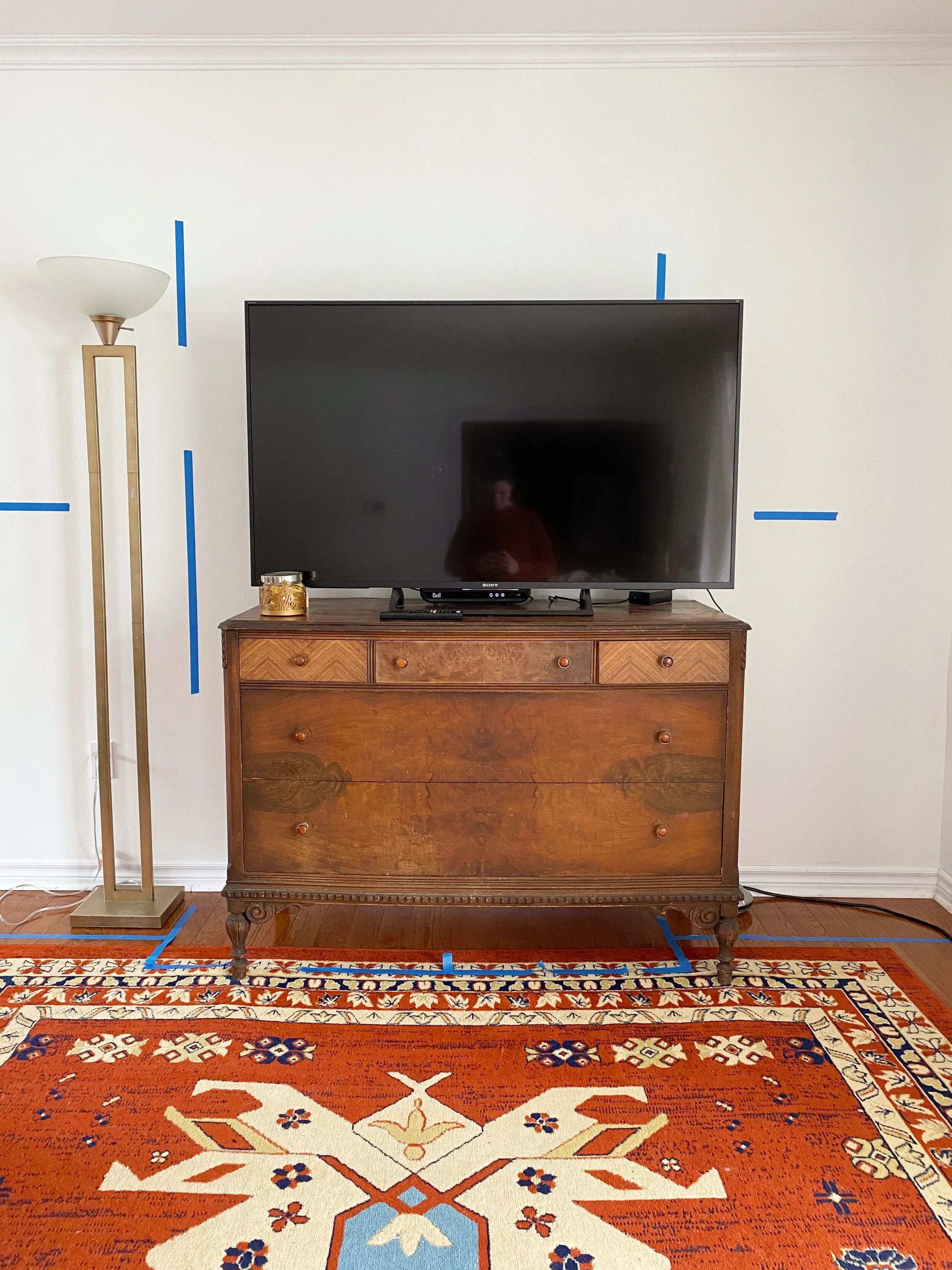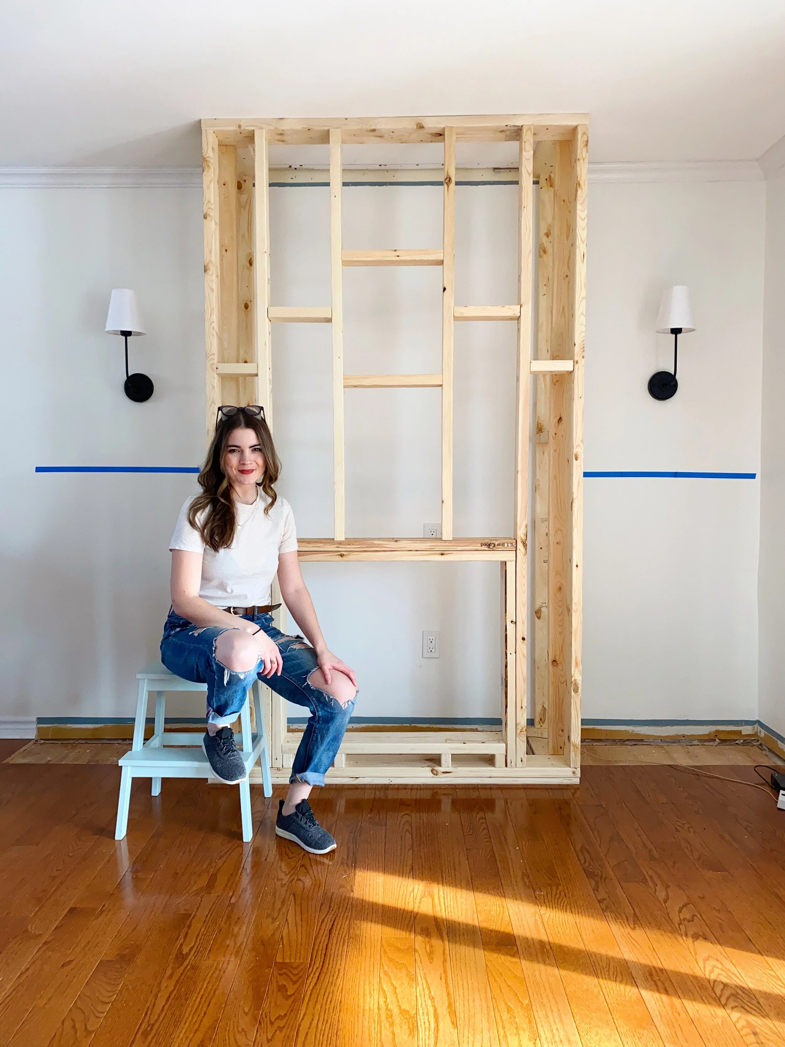 Where to begin? I started by gathering some inspiration photos. I want to build a unit that brings some focus and texture to our space. Ultimately, I landed on a couple of ideas and configurations that could work. I decided to go ahead and plan the project with a floor to ceiling unit to house the fireplace, sandwiched between two half-height built-ins on either side. I didn’t want any built out components on the actual fireplace component, other than potentially attaching a mantle piece separately once the unit is built. I made a detailed, to-scale drawing of our space with specific measurements in place so I had an idea about size and placement and then taped out the footprint on our floor and wall to give us an idea about scale and whether it felt right. Some things I had to consider when planning the size was that our 55” tv would be mounting on the top and we wanted a plug-in electric fireplace unit.