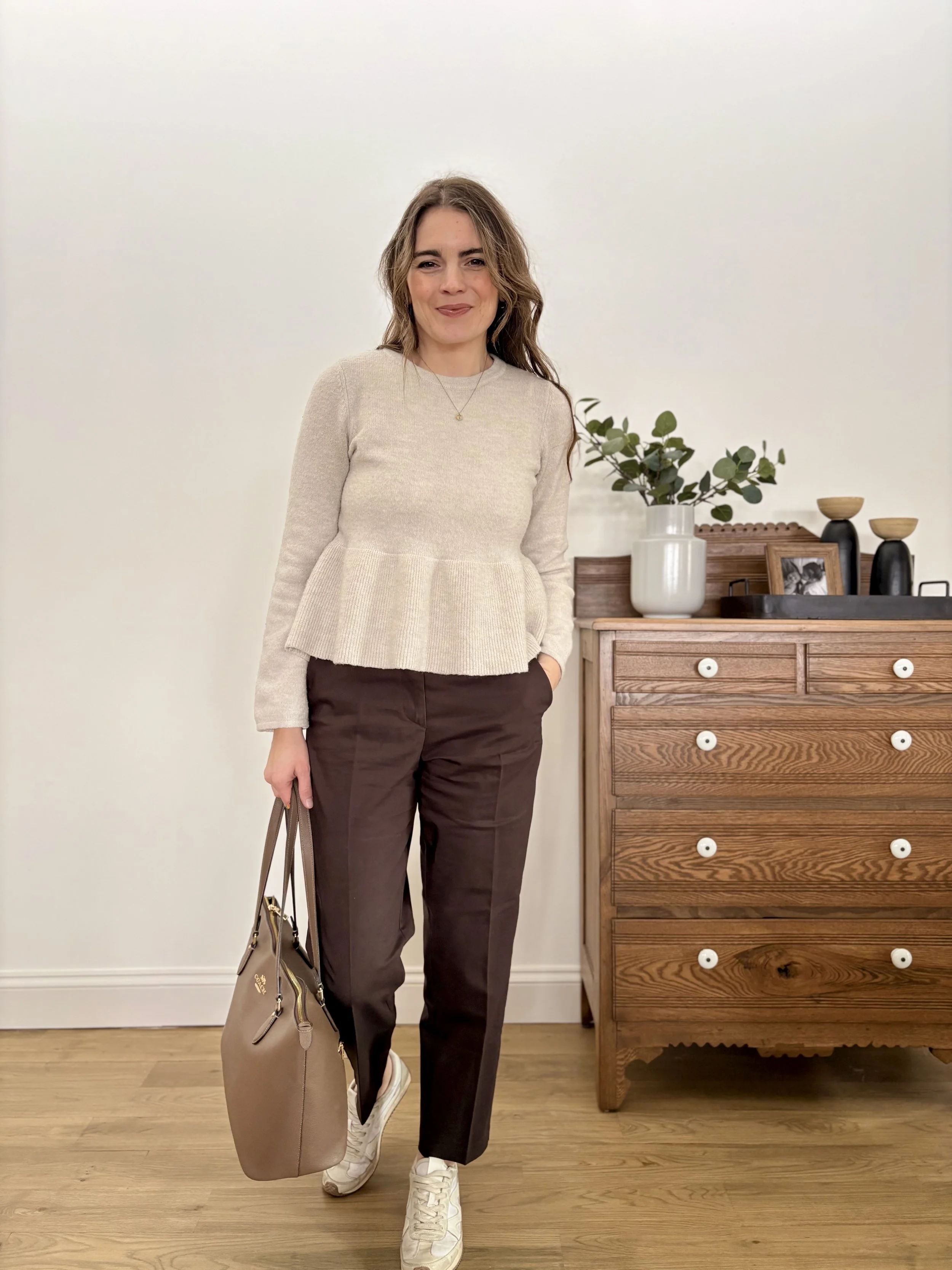 My final hack for a pulled together look while keeping it practical as a mom: a structured tote. I’ve been using this tote bag (similar here) from the Coach Outlet for a solid year and a half because it looks so clean and pulled together, but fits all the things. I use zippered pouches within it to keep things corralled together, like a couple diapers and wipes for my youngest, snacks, and simple activities (sticky notes, pens, stickers, etc) for waiting rooms. I also have a small crossbody purse tucked inside that holds all my cards, cash, and keys so that I can easily pull it out and just use that if I’m running in somewhere quickly. It has been a great practical system while still maintaining a classic style.