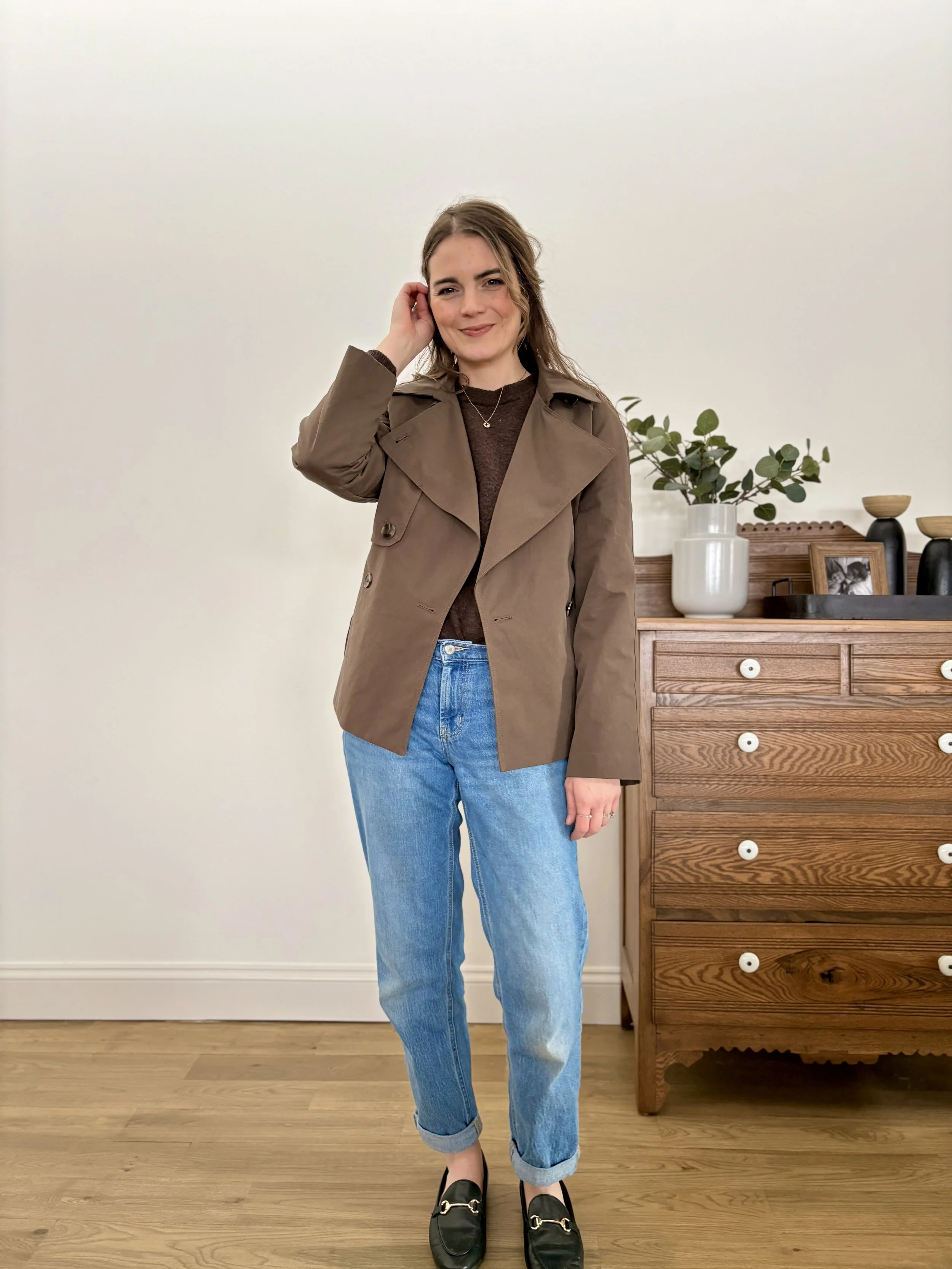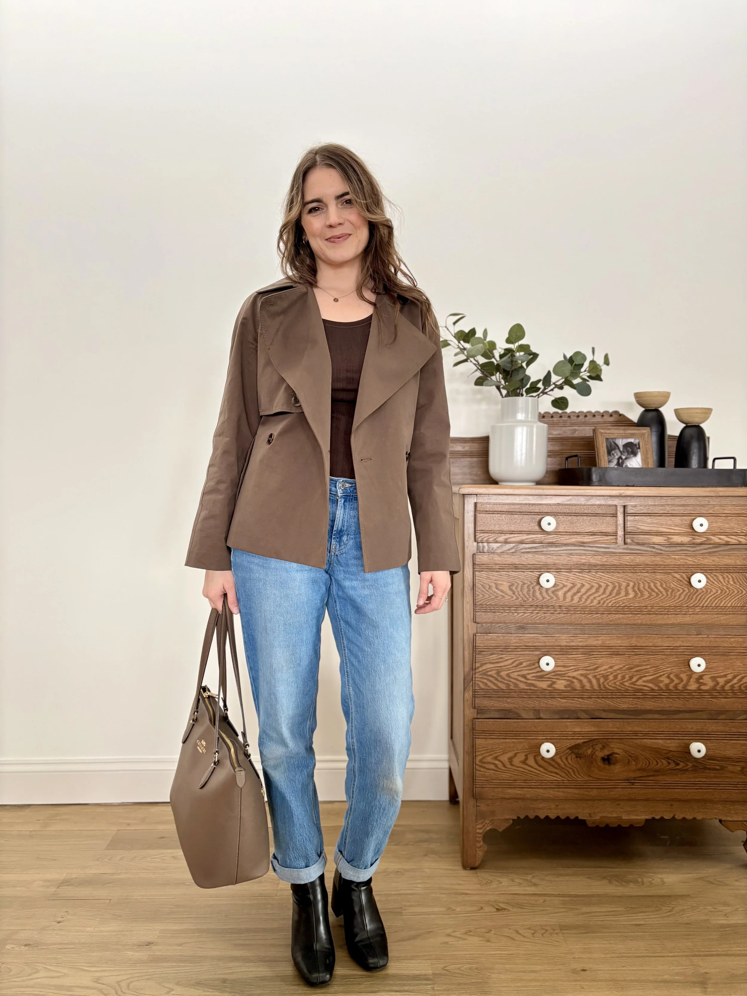Over the past couple of years, I’ve discovered that being selective with just a couple of versatile structured pieces can go a long way in making an outfit feel pulled together. These more structured pieces can be dressed up or down. These key pieces for me have been statement coats and a comfy pair of trousers. I recently picked up this short trench coat in a warm brown and have been able to wear it with nearly every outfit. Paired with a scarf, it still works on those chilly late winter days, but just as easily transitions into the spring if you tie the belt behind the back and wear it open.