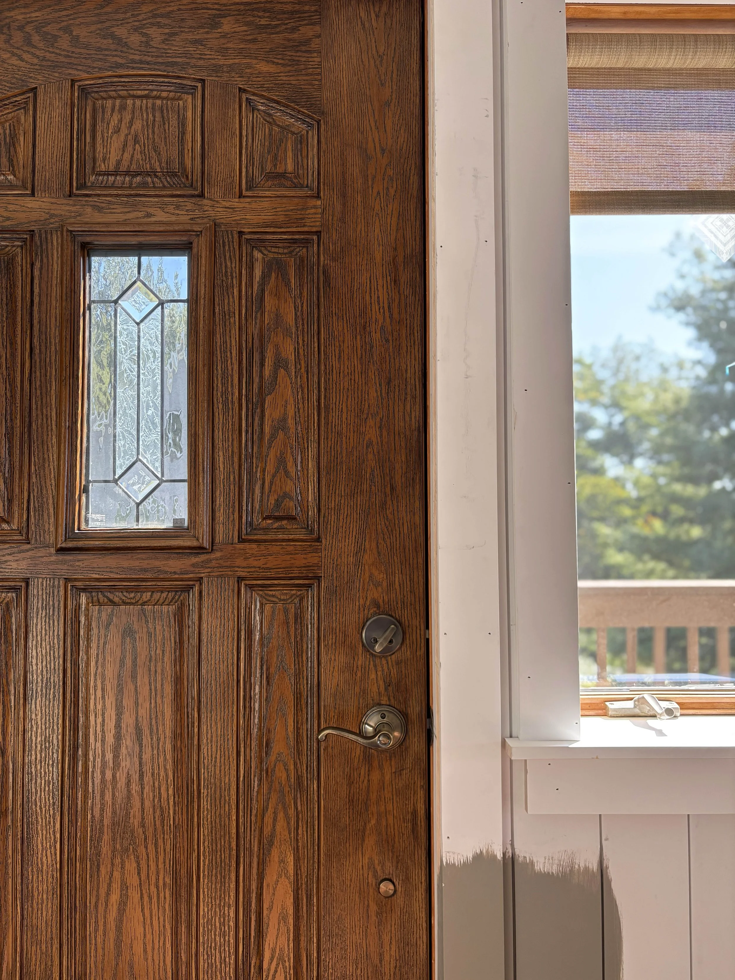 Since there have been numerous down days in these past four weeks, I took the opportunity to add a couple layers of a gel stain in walnut to our existing fibreglass front door. My original vision was to just paint the inside of the door in Bittersweet Chocolate by Benjamin Moore. However, I learned that you can apply gel stain to fibreglass and decided it would be worth the effort to at least try doing a dark wood finish first. With a couple of coats, I think it’s pretty close to my vision and I’m happy with it. Maybe this will change once all is said in done, but for now, I think it’s going to work well with the painted finish.