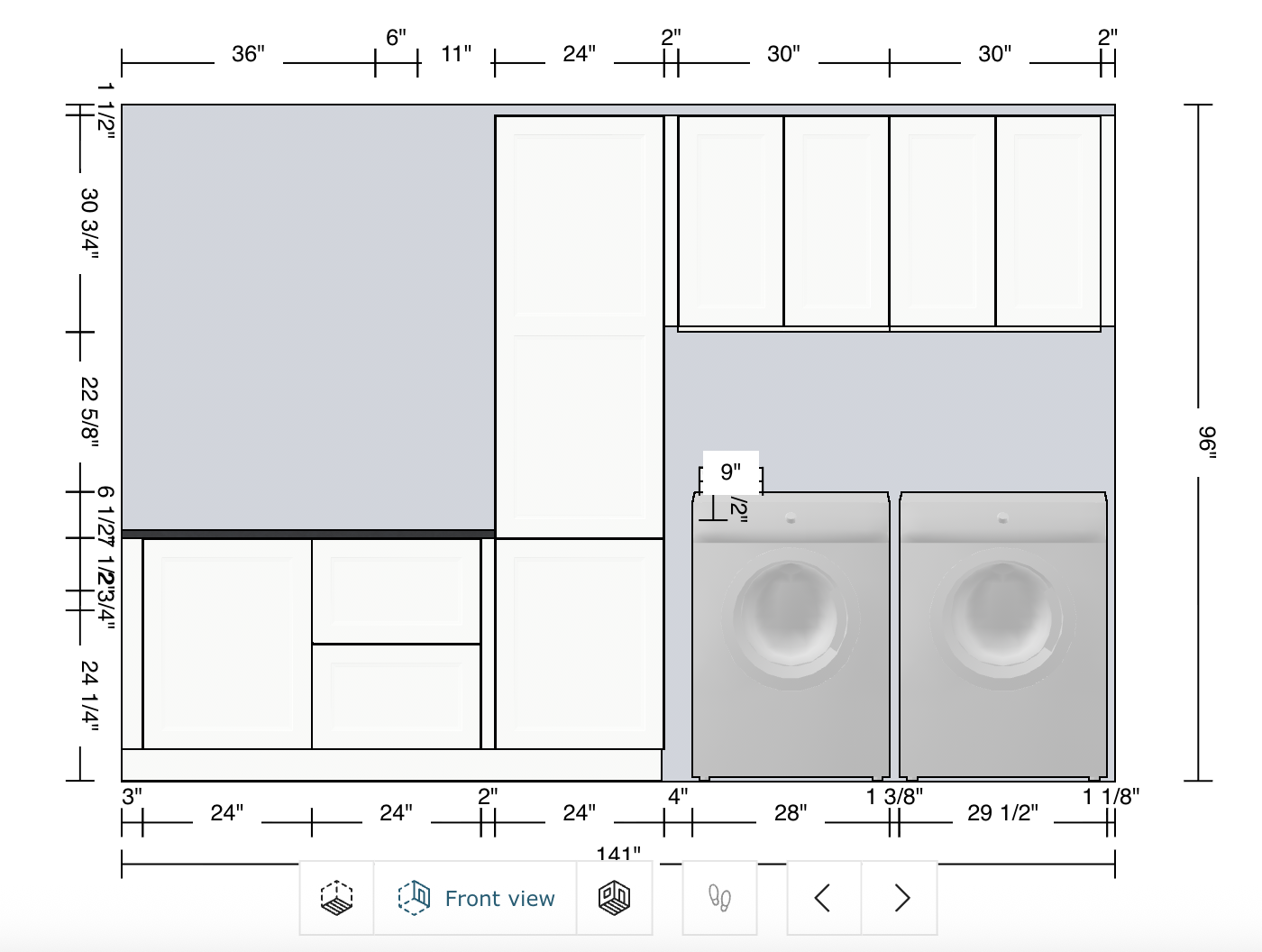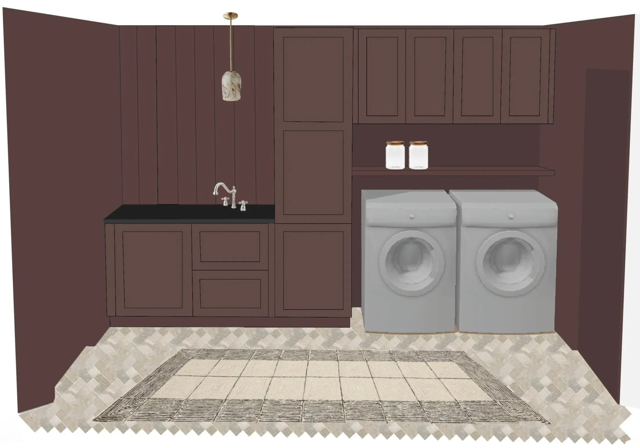 I ended up settling on the third version of the design that I created, using a tall cabinet in the center of the room to act as a spot to hang coats and store shoes, hats, and kids’ backpacks for our everyday items. The upper cabinetry above the laundry machines will store laundry and miscellaneous items (like party supplies, spare batteries, flashlights, etc). The sink cabinet and additional lower cabinet will store cleaning supplies and overflow pantry items. The room will still have a small sink and a little bit of counter space too. With a little bit of customizing, I think it will make the most of our small laundry/mudroom/pantry space and it all clocked in around $2000.