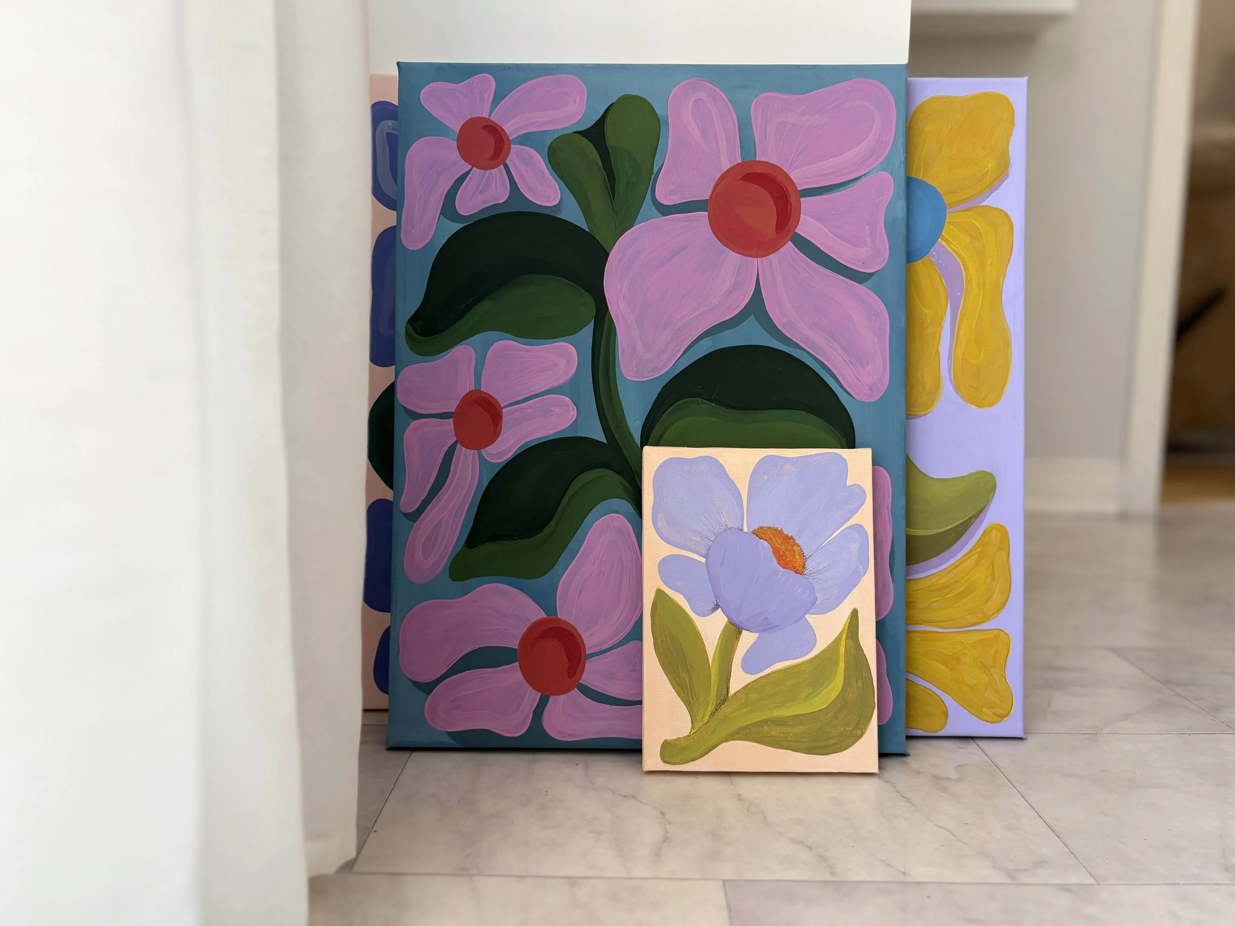I’m a graphic designer who primarily works digitally these days, but I’m constantly exploring how the digital landscape translates to the physical. Over the past year, I’ve casually been working on a series of graphic digital illustrations of flowers and then have joyfully been recreating them with paint on canvas. It has been fun. I’ve enjoyed playing with graphic colour palettes and flat graphic styles and then experimenting with how those shift once they’re rendered in paint. I hope to continue working at my flower paintings with little regard for the end result. With this one, the process is the fun of it.