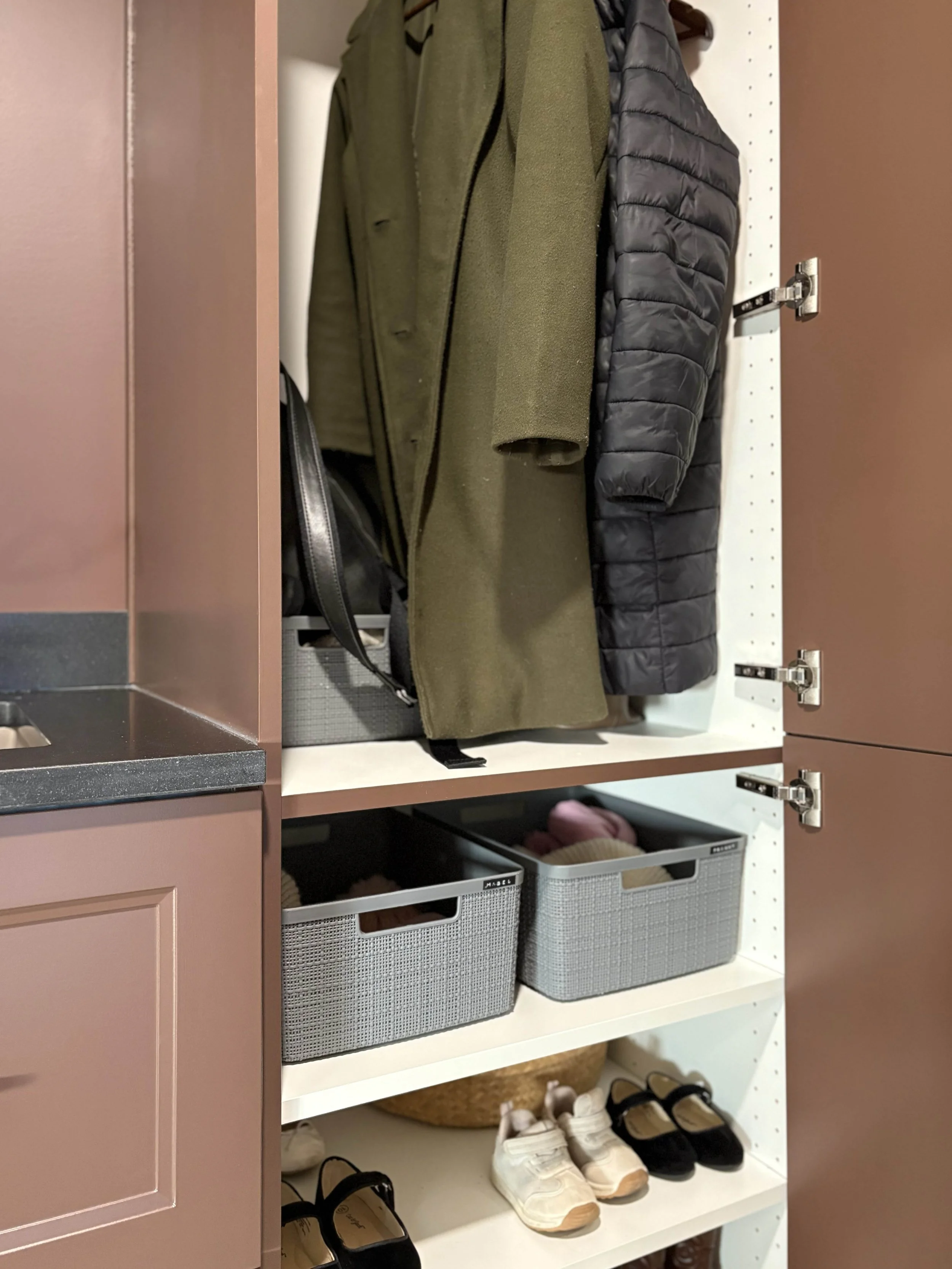 In the full-height cabinet, I left out the adjustable shelves (although I have them in the garage if we ever need them) and installed a wooden hanging bar right into some of the pre-drilled holes within the cabinet. We can very easily remove this if we ever change our mind and turn this cabinet into shelf storage instead. The interior is not huge, but we are able to store the kids’ snow pants and 4-5 adult coats comfortably. We prioritize only keeping our everyday coats and shoes here and have our other coats stored in the front entryway closet. I purchased a handful of matching plastic storage baskets and we each have one to store our personal mittens, scarves, hats, and earmuffs. This system has particularly worked well for our girls! On the bottom portion of the cabinet, I installed the adjustable shelves and we keep some of our most worn pairs of shoes in there for easy access.