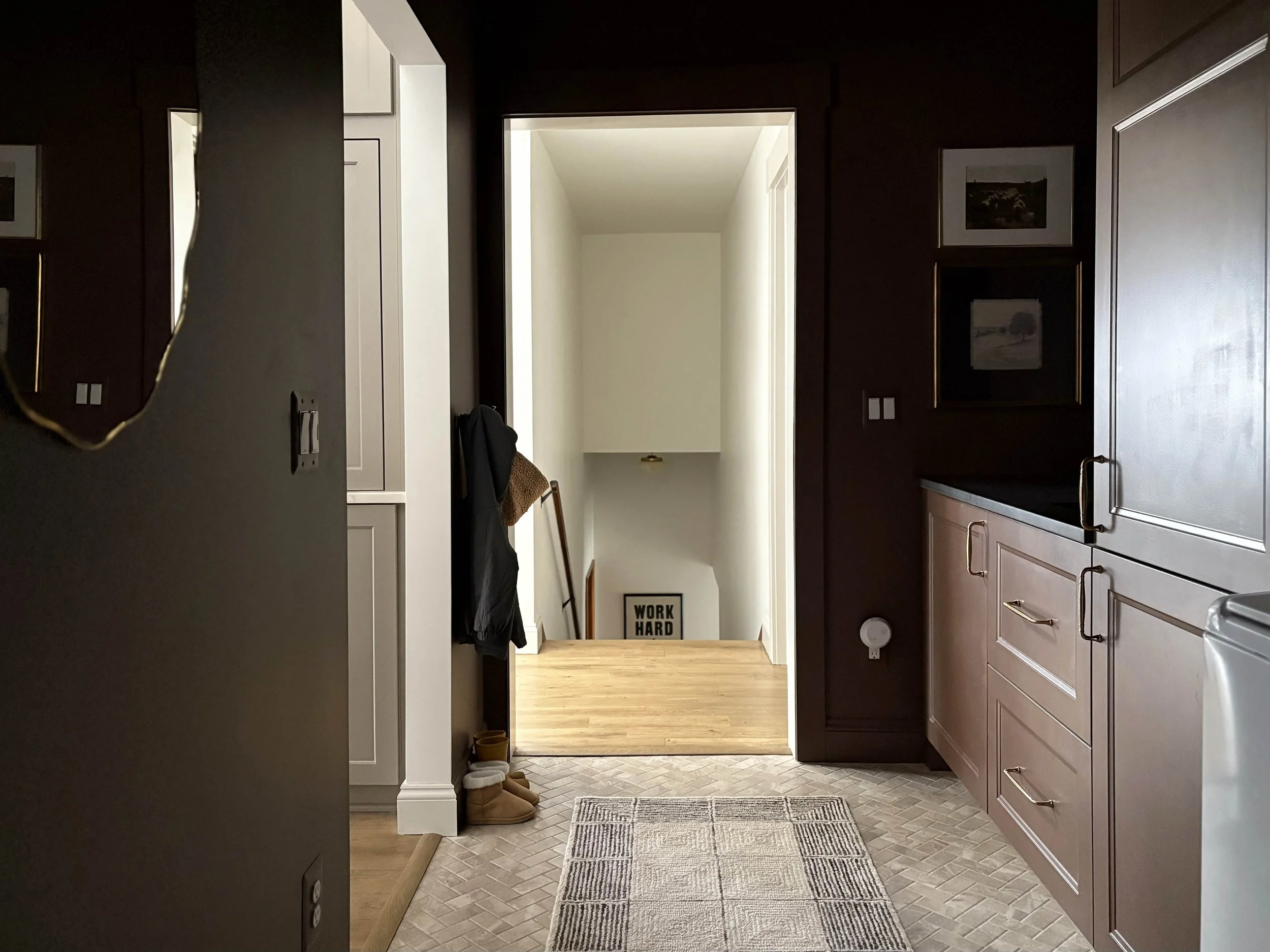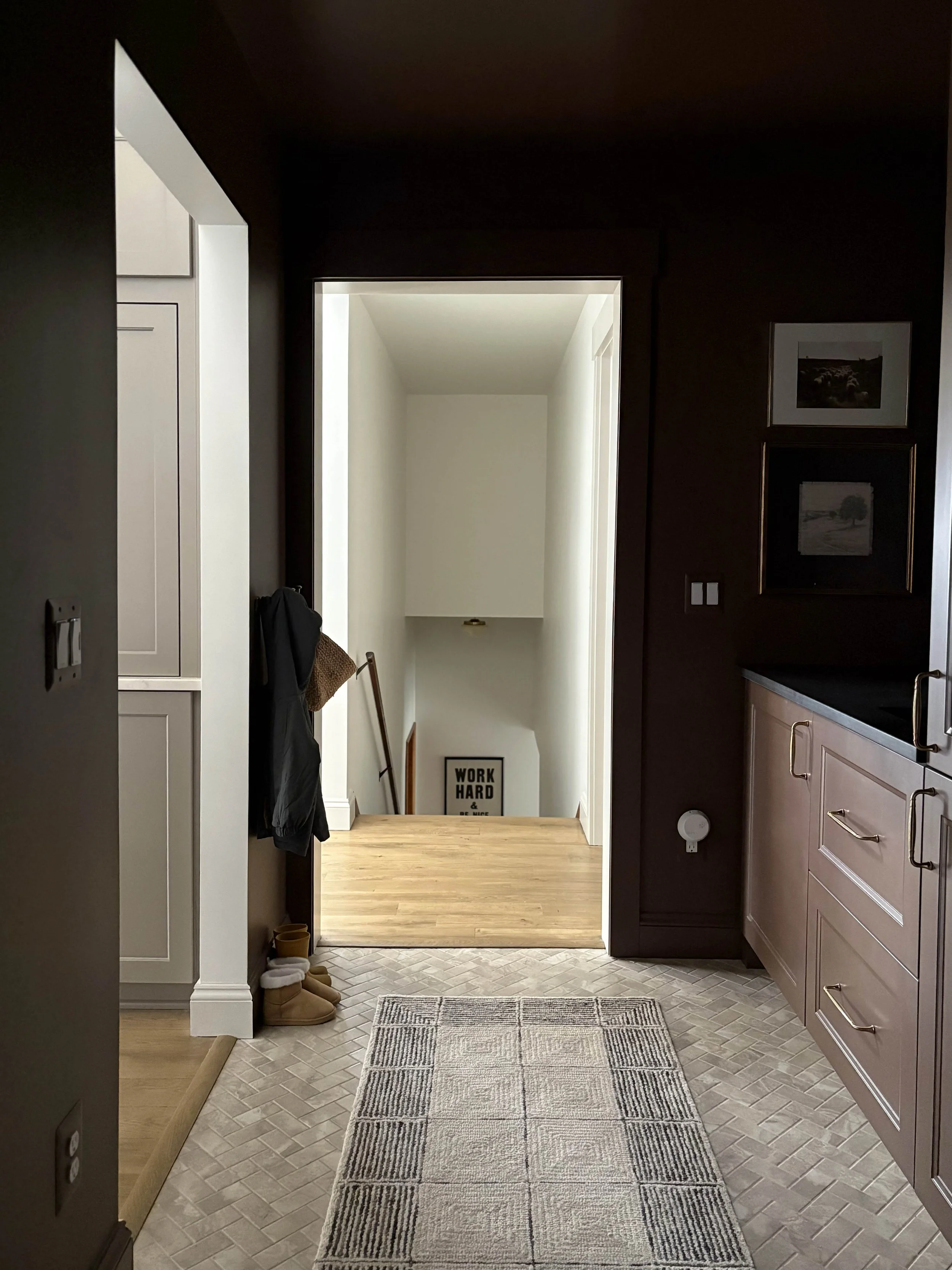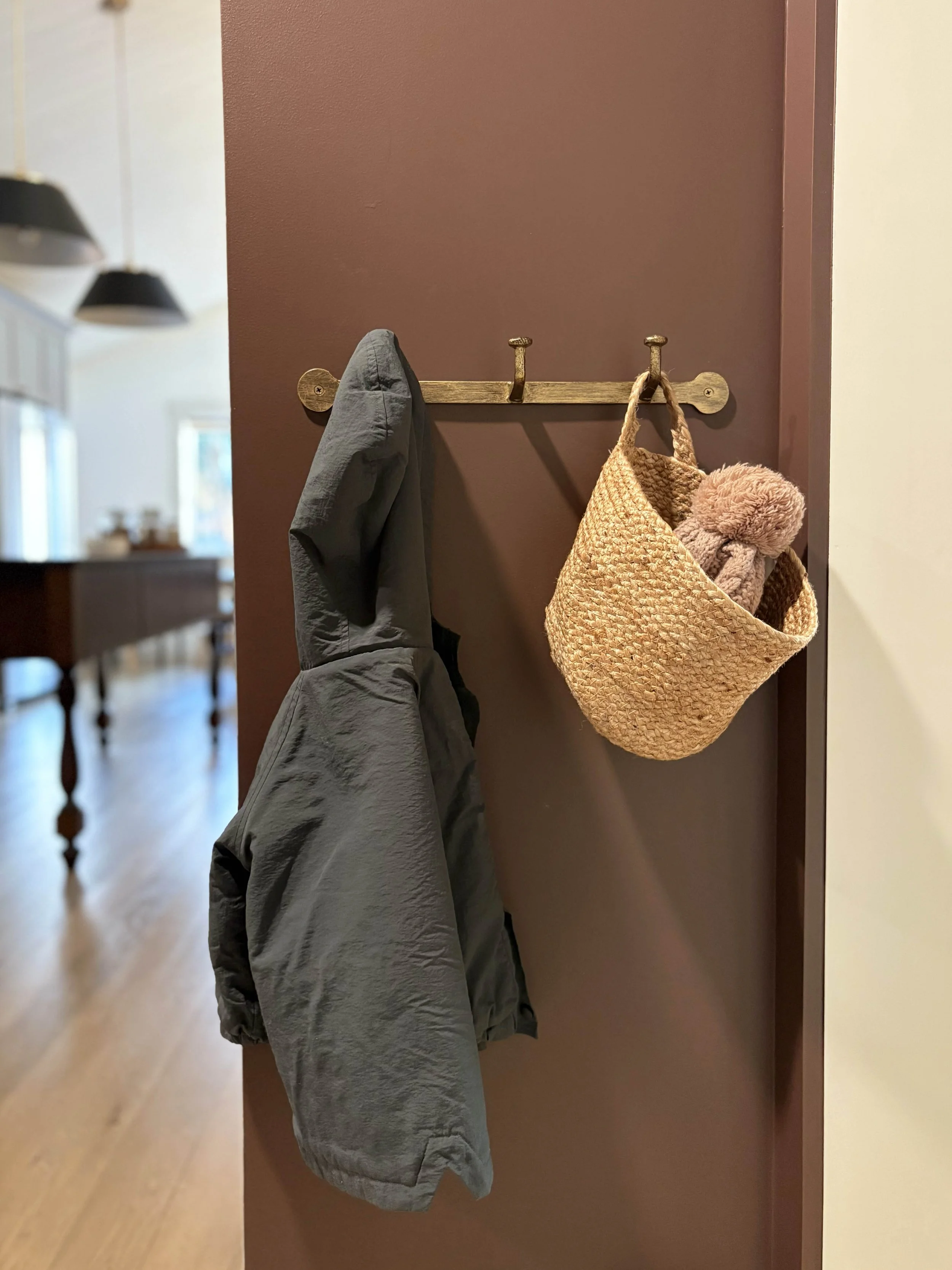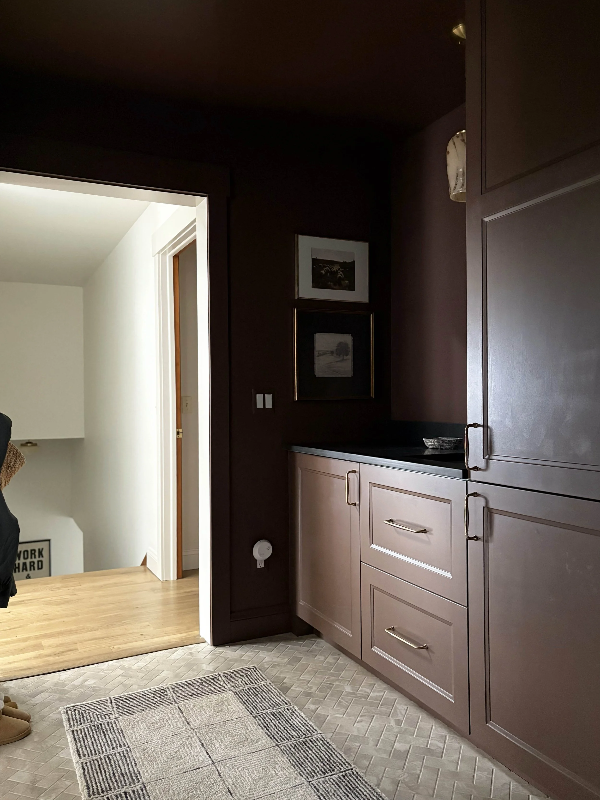 Let’s start with the color choice because that is definitely what I get the most comments on. I really wanted the design of this room to exude the strength of this little powerhouse space and so I decided to go all-in. We completely color-drenched this room - walls, ceiling, trim, cabinetry. Everything. I wanted the color to be moody and impactful, but still be neutral enough to connect with all the other tones and finishes throughout our main living space. I settled on this rich brown tone after swatching a handful of colors on the walls and feeling that this one struck the right balance of brown, red, and purple. It’s called Hasbrouck Brown by Benjamin Moore and makes you feel like you’re stepping into a hug when you walk in the door.