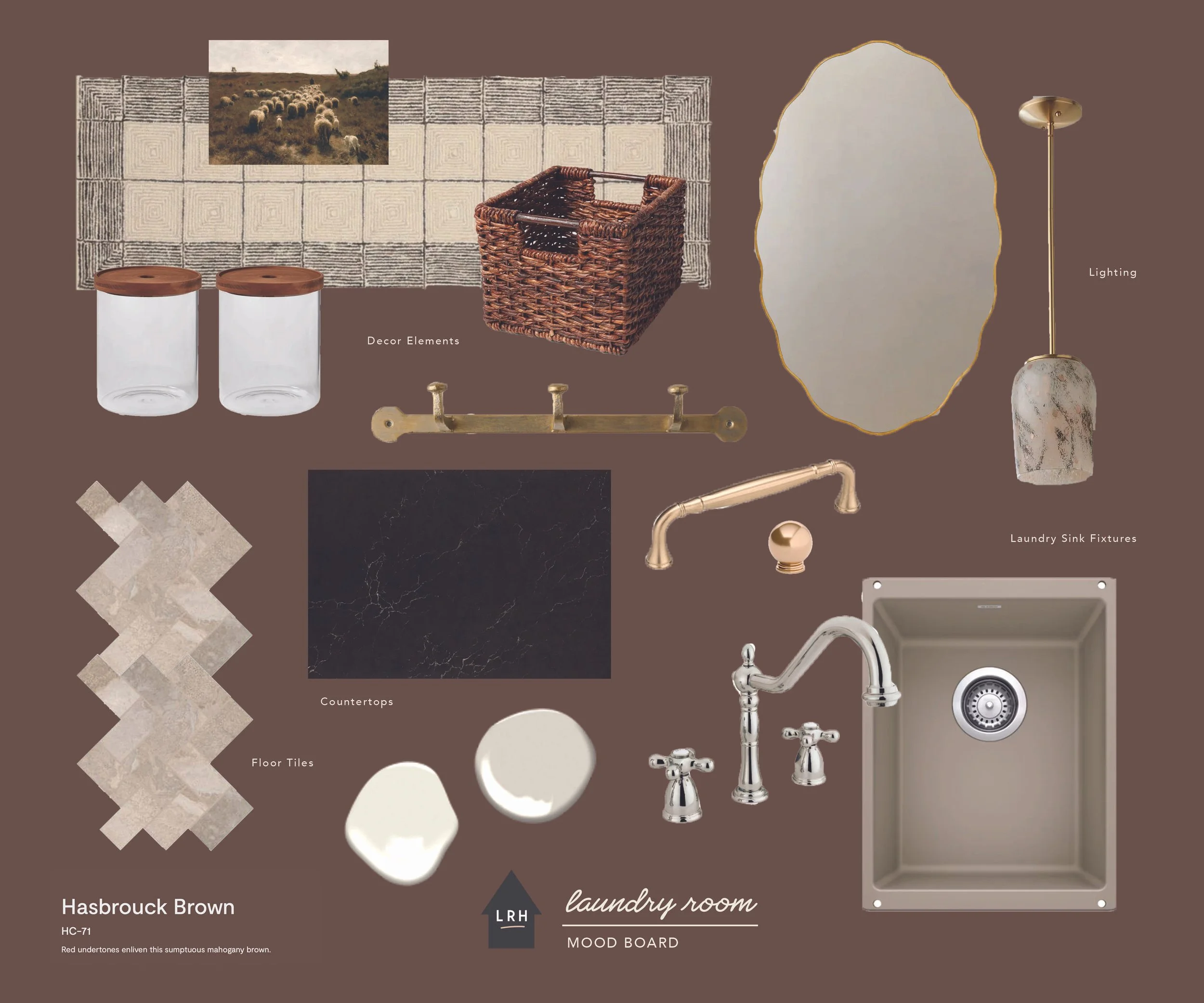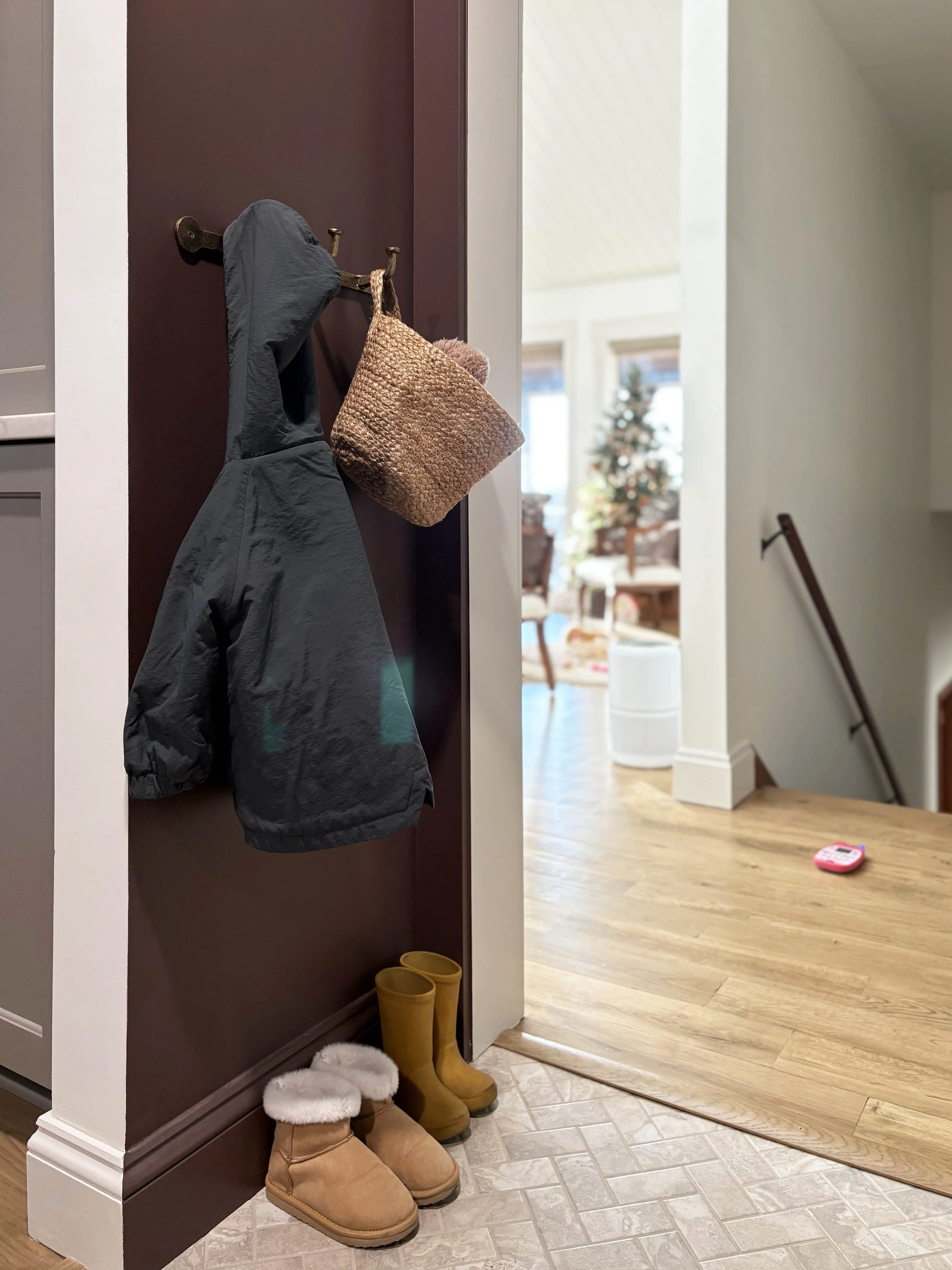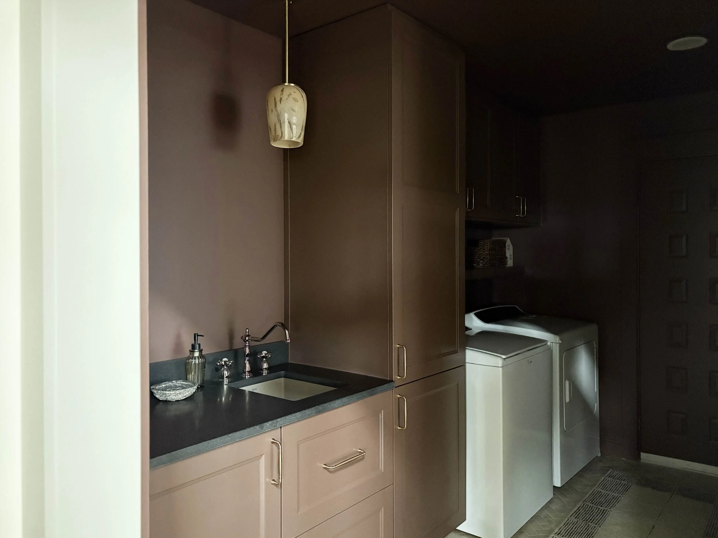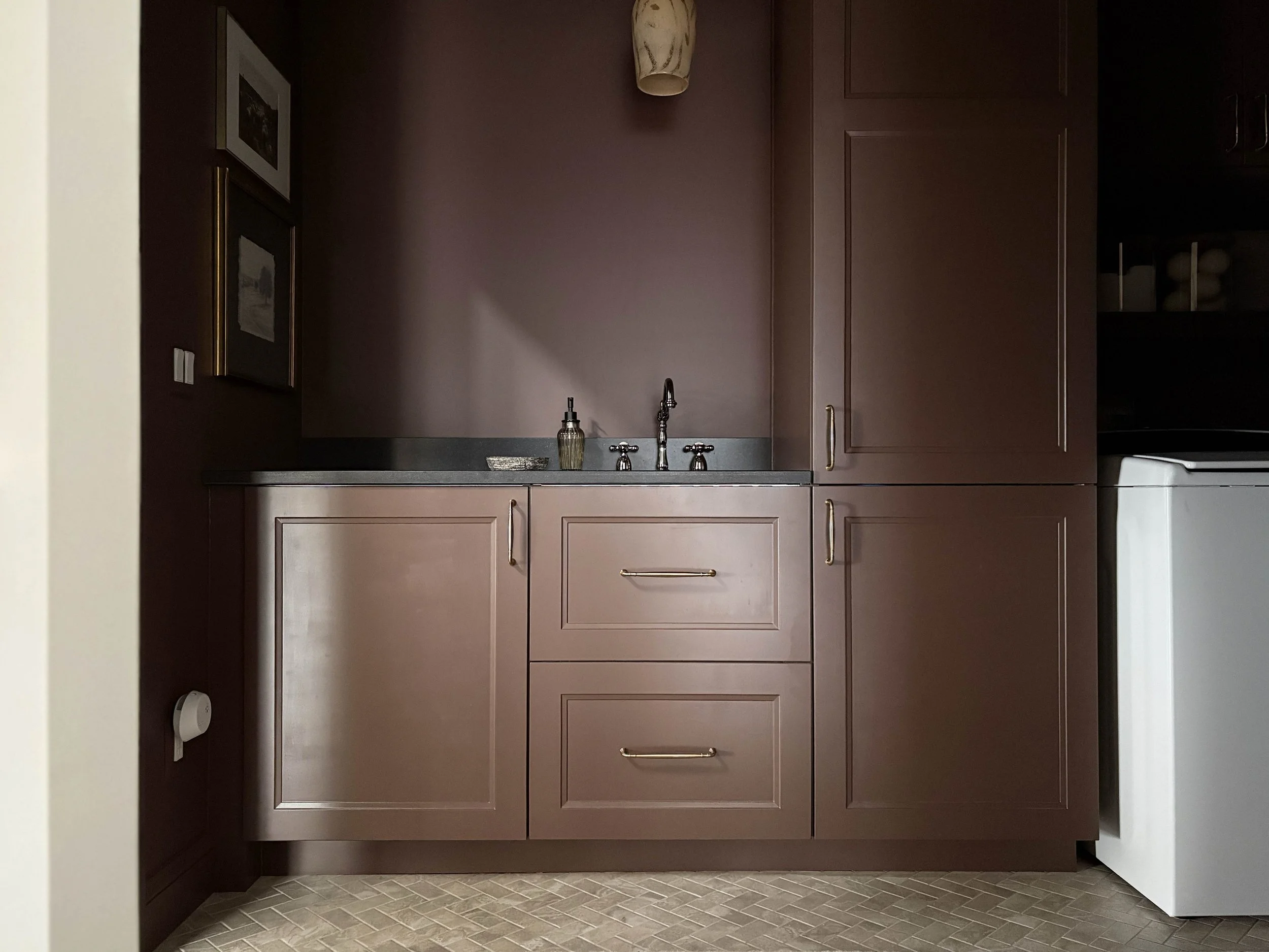 Let’s start with the color choice because that is definitely what I get the most comments on. I really wanted the design of this room to exude the strength of this little powerhouse space and so I decided to go all-in. We completely color-drenched this room - walls, ceiling, trim, cabinetry. Everything. I wanted the color to be moody and impactful, but still be neutral enough to connect with all the other tones and finishes throughout our main living space. I settled on this rich brown tone after swatching a handful of colors on the walls and feeling that this one struck the right balance of brown, red, and purple. It’s called Hasbrouck Brown by Benjamin Moore and makes you feel like you’re stepping into a hug when you walk in the door.