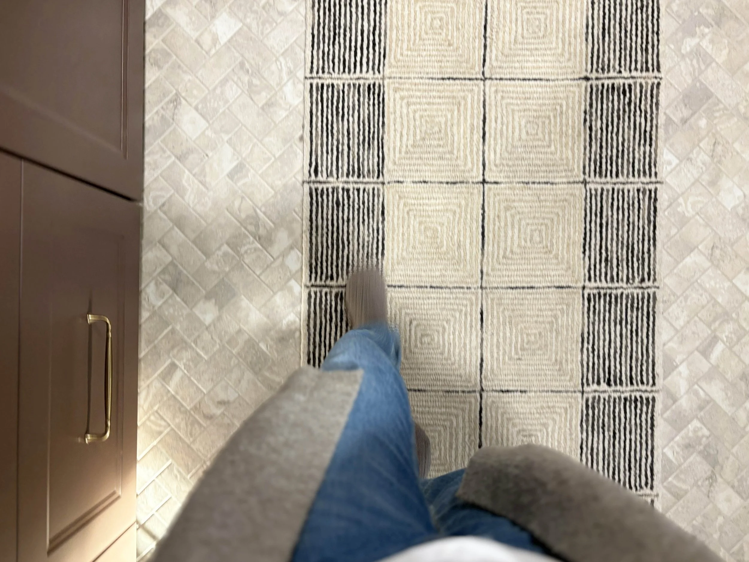 The final design element to talk about are the floors. I really wanted to use tile for practical reasons, but I originally envisioned a large scale tile. Once construction began, we learned how wonky our floors are and long story short, a large format tile would have immediately cracked with use. We had to pivot and I kept sourcing tiles I loved, only to be told it was still too large. Eventually it was made clear that we had to use a tile available on a sheet and my heart sank. I really didn’t want a mosaic look. With a lot of research and perusing, these small-format herringbone mosaic tiles were the only ones I could find that I even somewhat liked. I ordered a sample and once I saw them in person, I knew they would be perfect. We had them installed using an ivory grout and I really love the texture the small format size brings to this room. It ended up being a perfect choice. I also laid a neutral runner down the length of the room and the combination of the textured tile with the graphic rug feels so interesting without drawing too much attention.