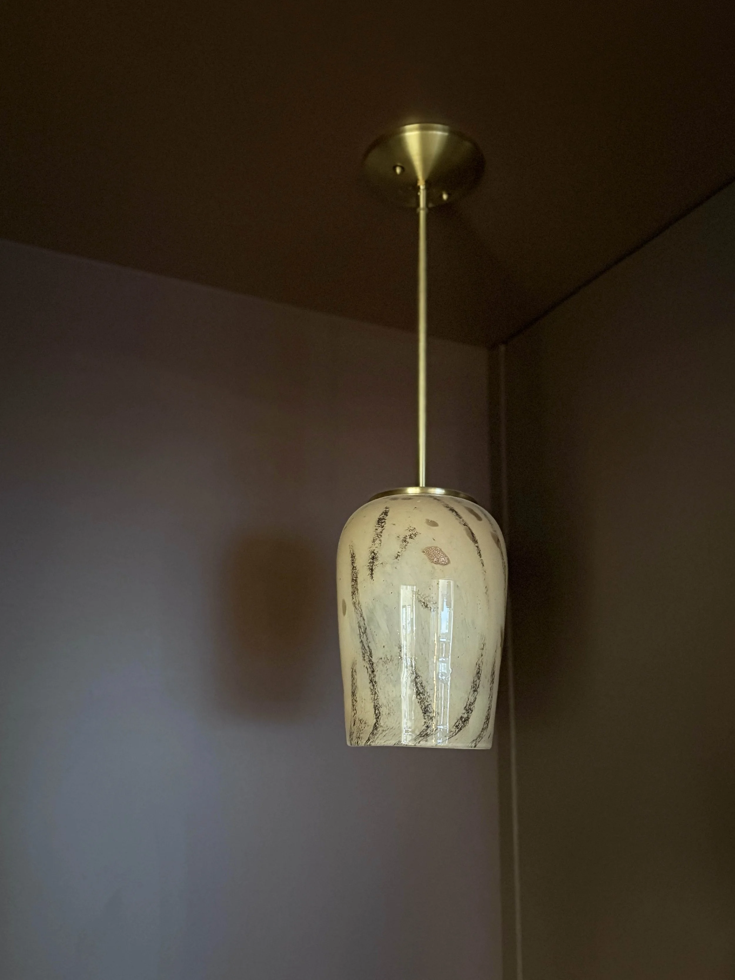 As the main view of this space from our main living area, I really wanted to create a little design moment over the laundry sink. We had can lights installed in the laundry room for the sake of practicality, but I also had them wire for a pendant above the sink. I came across this beautiful hand-blown glass pendant after choosing all the other fixtures for our renovation and I couldn’t get it out of my mind once I saw it. I’m so glad I decided to shift gears and use it here in the laundry room. It’s such a small but mighty little fixture and I love the warm glow it gives when we have it on in the evenings. I do still plan on adding some vertical shiplap panelling to this little wall behind the sink to tie in to the vertical shiplap we have on the sloped ceilings of our main living space and I think it will help make this little view even more of a visual moment.