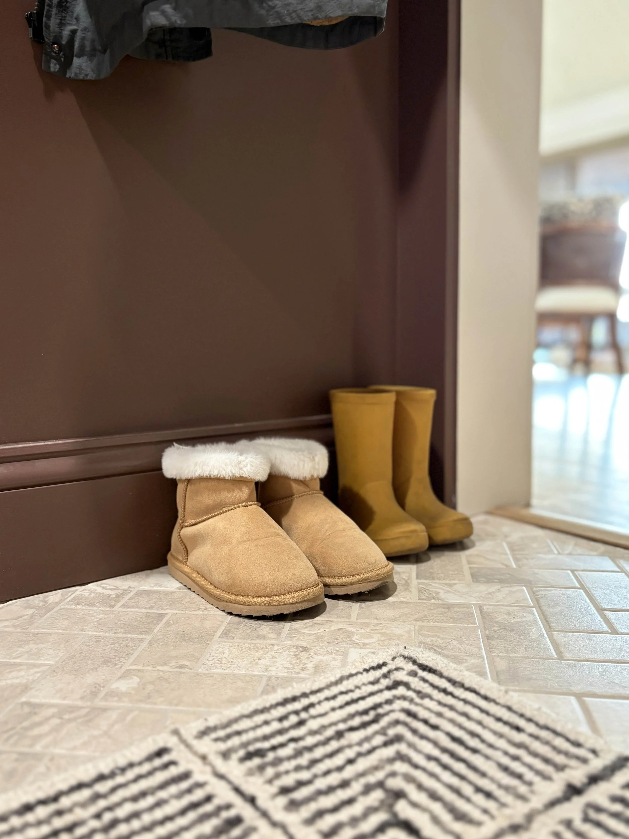 My intention while designing this space was to strike the balance between practicality and functionality while still creating a peaceful way to enter our home. As you can see from the photos, this room is a main walkway into our house and we are bouncing in and out of here constantly as we move throughout the home. I wanted every view to feel beautiful, but also truly serve our needs. These next photos are intended to highlight some of those components, which is why I included some photos with the lights on in the space. I wanted to show you the design in natural light (which more accurately shows some of the finishes), but also wanted to demonstrate how it functions in our normal day to day life.