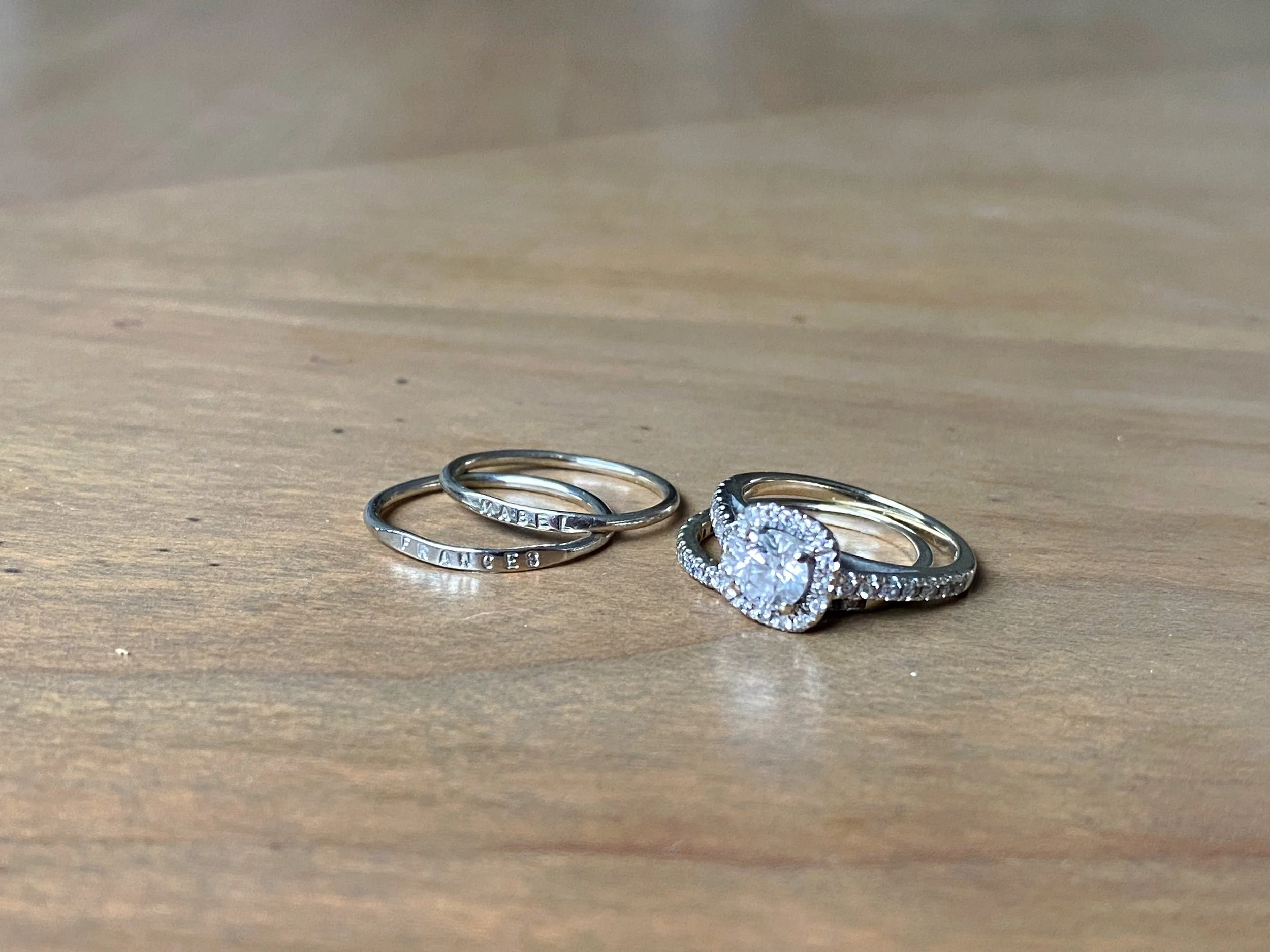 I custom ordered a Frances ring to add to my stack and it arrived the other week. Curtis gifted me a white gold ring with Mabel’s name on it shortly after we had her and I’ve always worn it stacked with my wedding band and engagement ring. It was only a matter of time before I added Franny and now every time I catch a glance at my hand, a huge smile sweeps across my face.