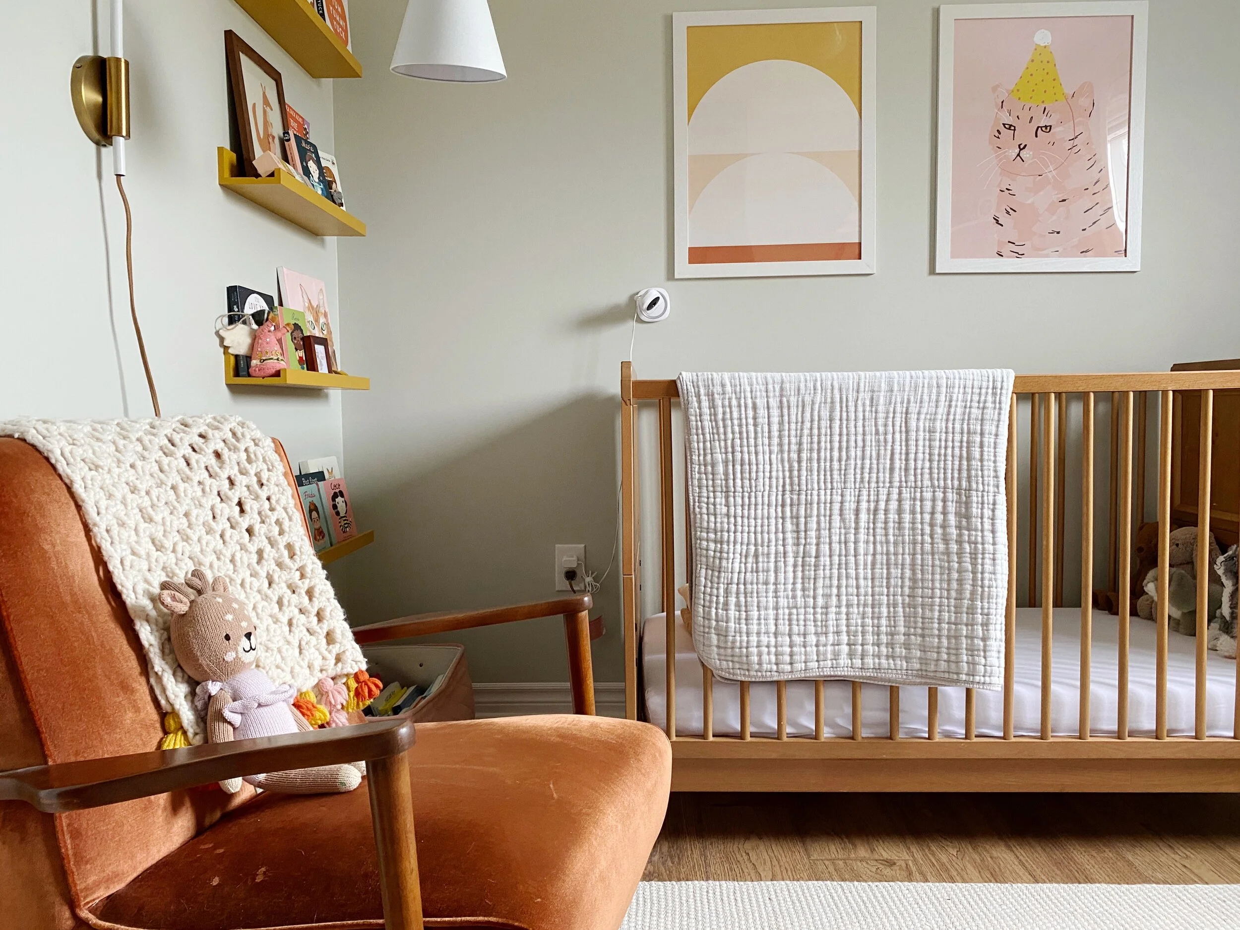 In our own home, I have multiple pieces of artwork that I purchased online. The set of posters in Mabel’s room that hang above her crib were created by different artists, but I purchased both on Society 6. I ordered them as poster prints, so they were only about $20 each. I knew that Mabel would probably outgrow these as she grows up, so I didn’t feel as guilty purchasing them because I know I can easily change them out if I need to. This is a really great option if you are on a budget.